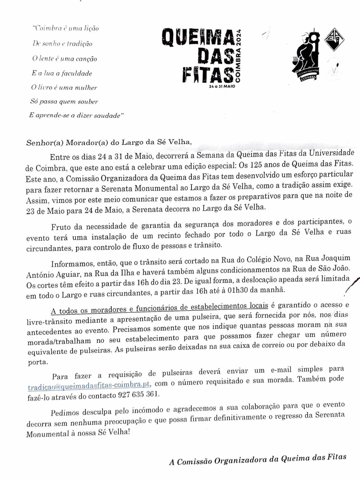 O comunicado contradiz, no entanto, as cartas enviadas pela mesma comissão em aos moradores do largo da Sé Velha, dando conta dos preparativos para que, na noite de 23 para 24 de maio, a Serenata Monumental decorra naquele local.